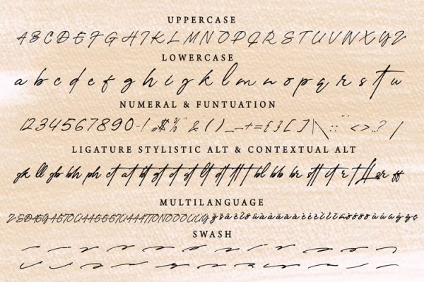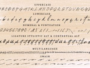 Brigitte Eigner (.ttf & .otf .woff) comes with upper and lowercase Standard Characters, Punctuation, Numerals. And other Glyphs.