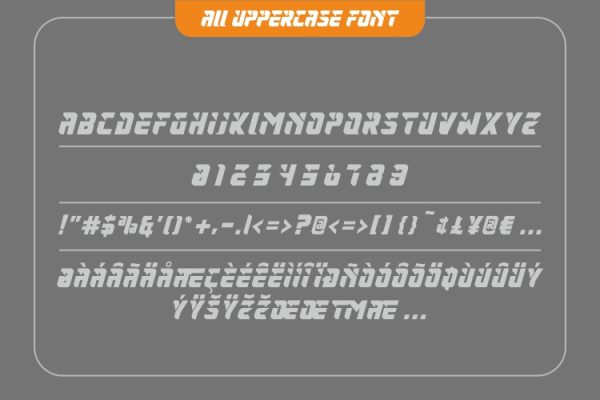 Esports GT (.ttf .otf .woff) comes with upper and lowercase Standard Characters, Punctuation, Numerals. And other Glyphs.