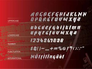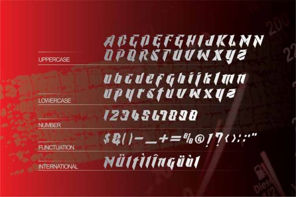 Road Racer (.ttf .otf .woff) comes with upper and lowercase Standard Characters, Punctuation, Numerals. And other Glyphs.